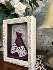 写真では伝わりにくいかもしれませんが、レースの部分にシルバーの細い糸を織り込み、さりげない輝きを加えています。この細やかなディテールが、全体の雰囲気をより一層引き立てていると思います。
